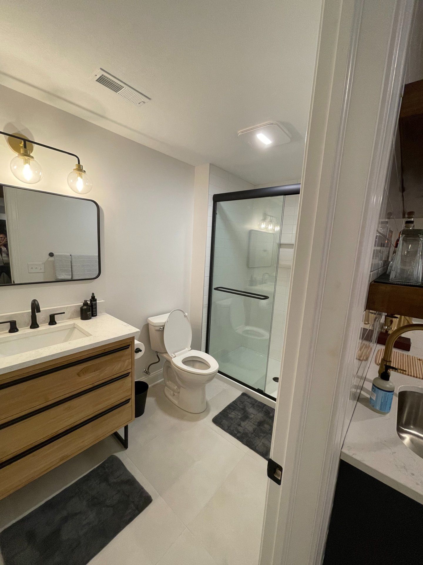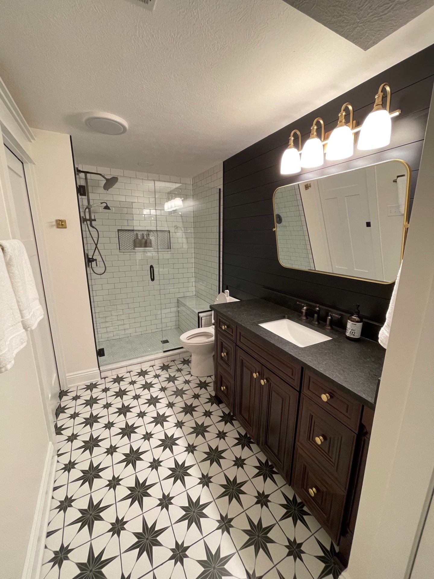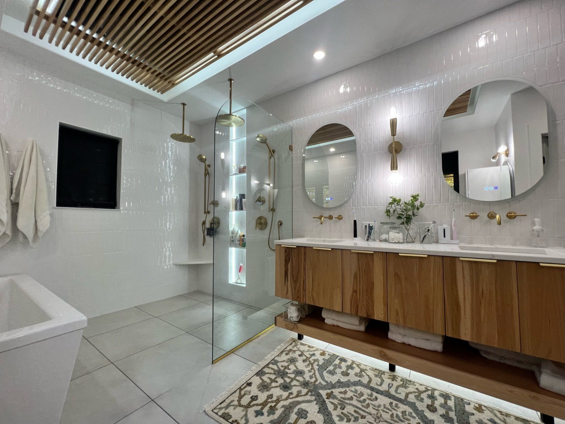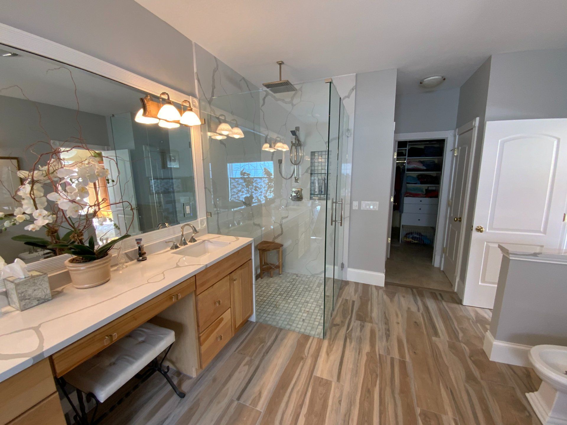 We also can build curbless wet rooms, where the bathtub, shower and vanity are designed so the entire bathroom area can get wet. We only need about 60 square feet to add a wet room to any bathroom remodel and with a curbless shower and no walls the space feels bigger than it really is.