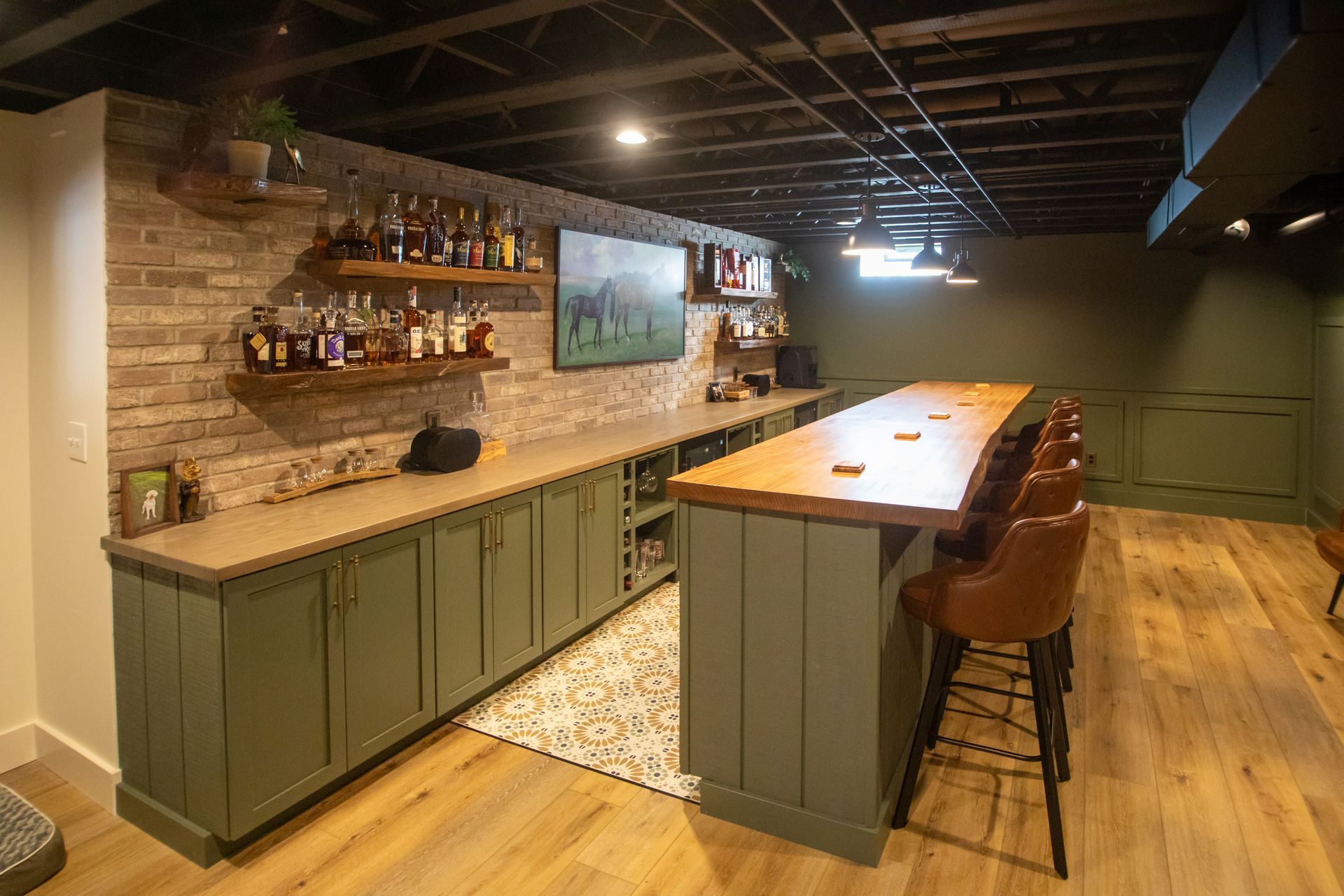 Basement entertainment area with a bar, brick accent wall, and wood-slat ceiling, including a projector.