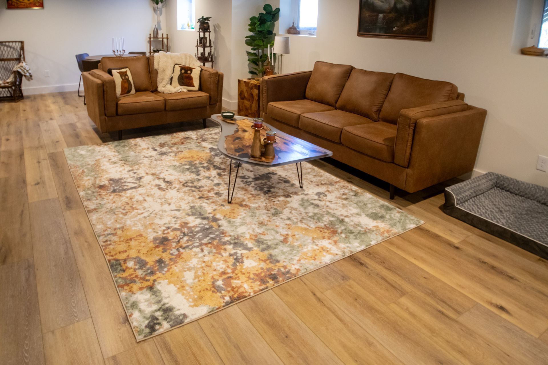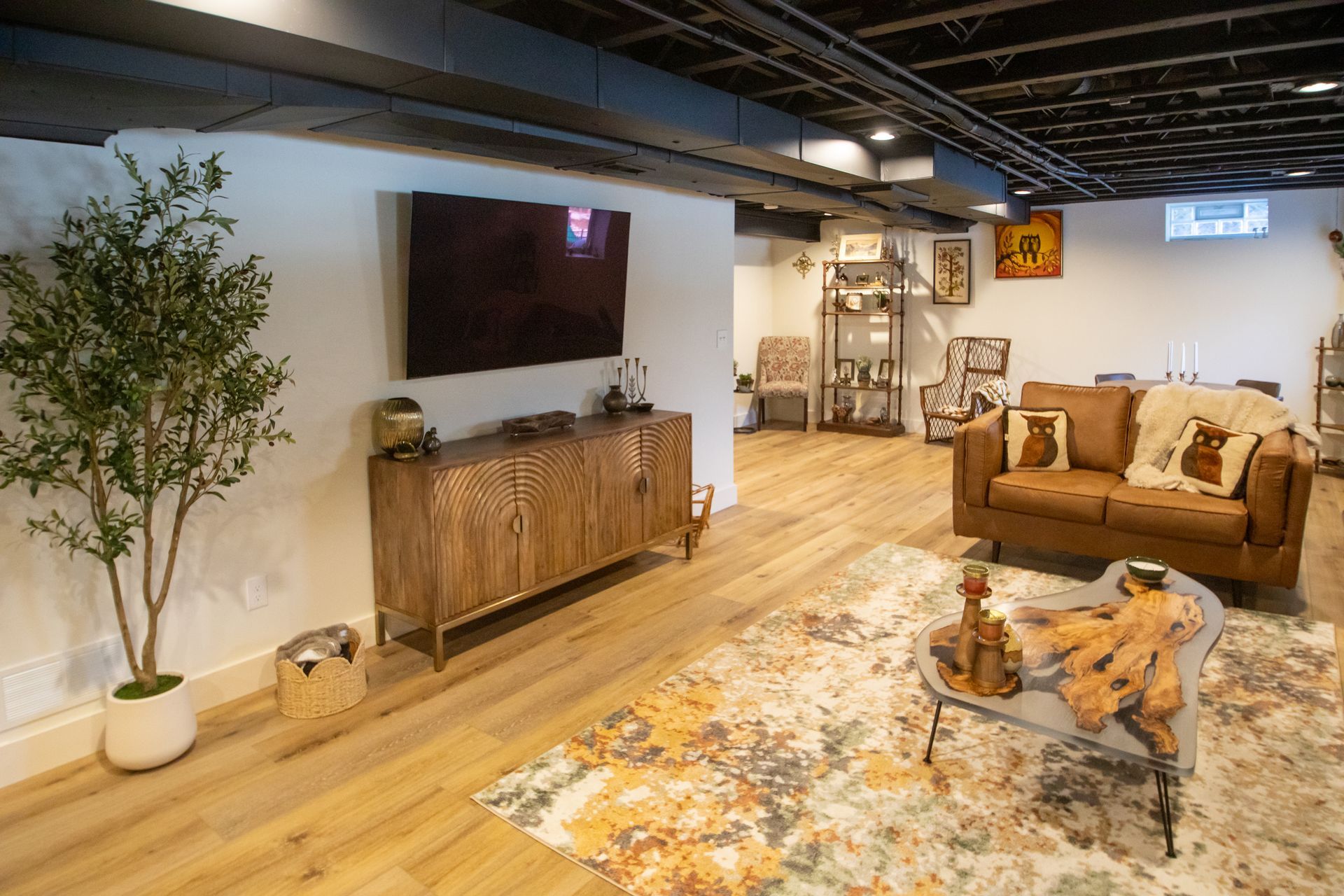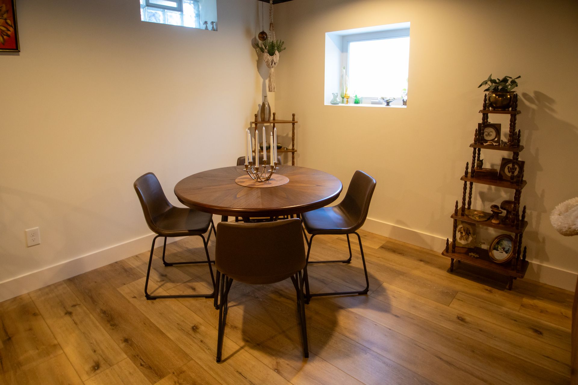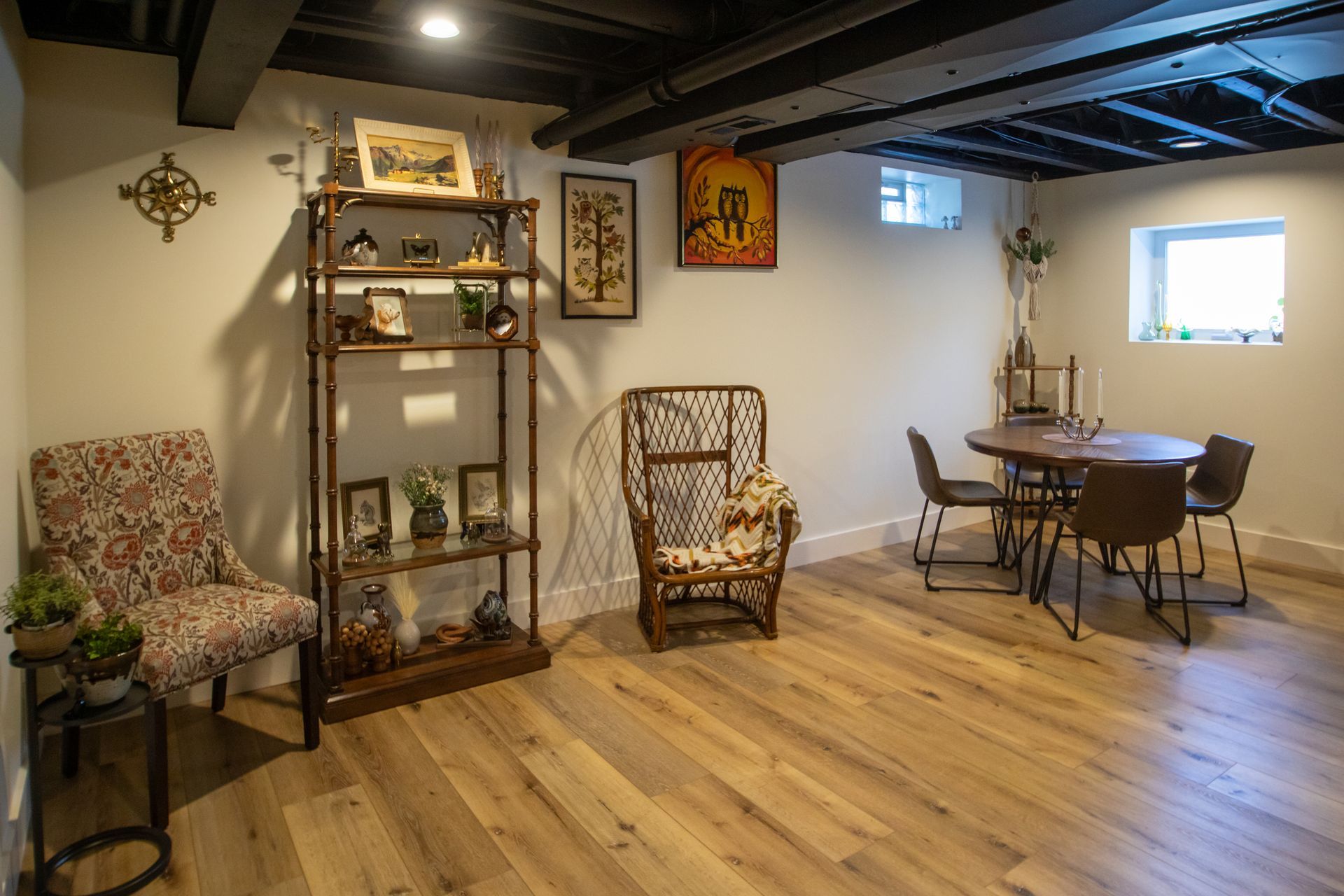 Basement with wood-look flooring, built-in white shelves, dark brown support column, and a staircase.