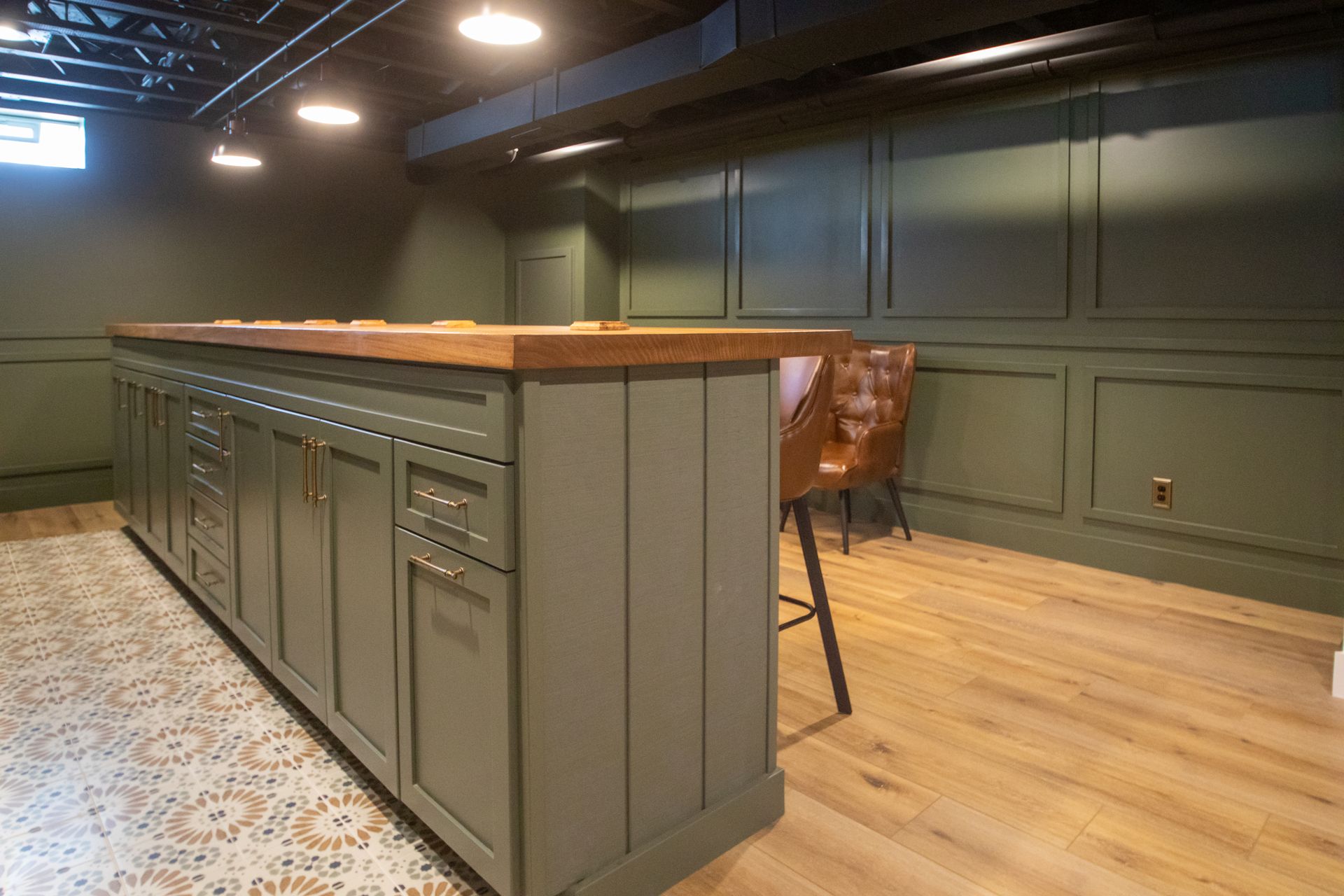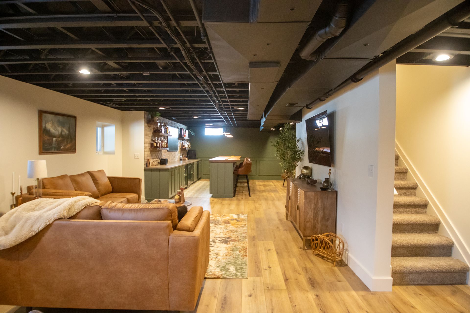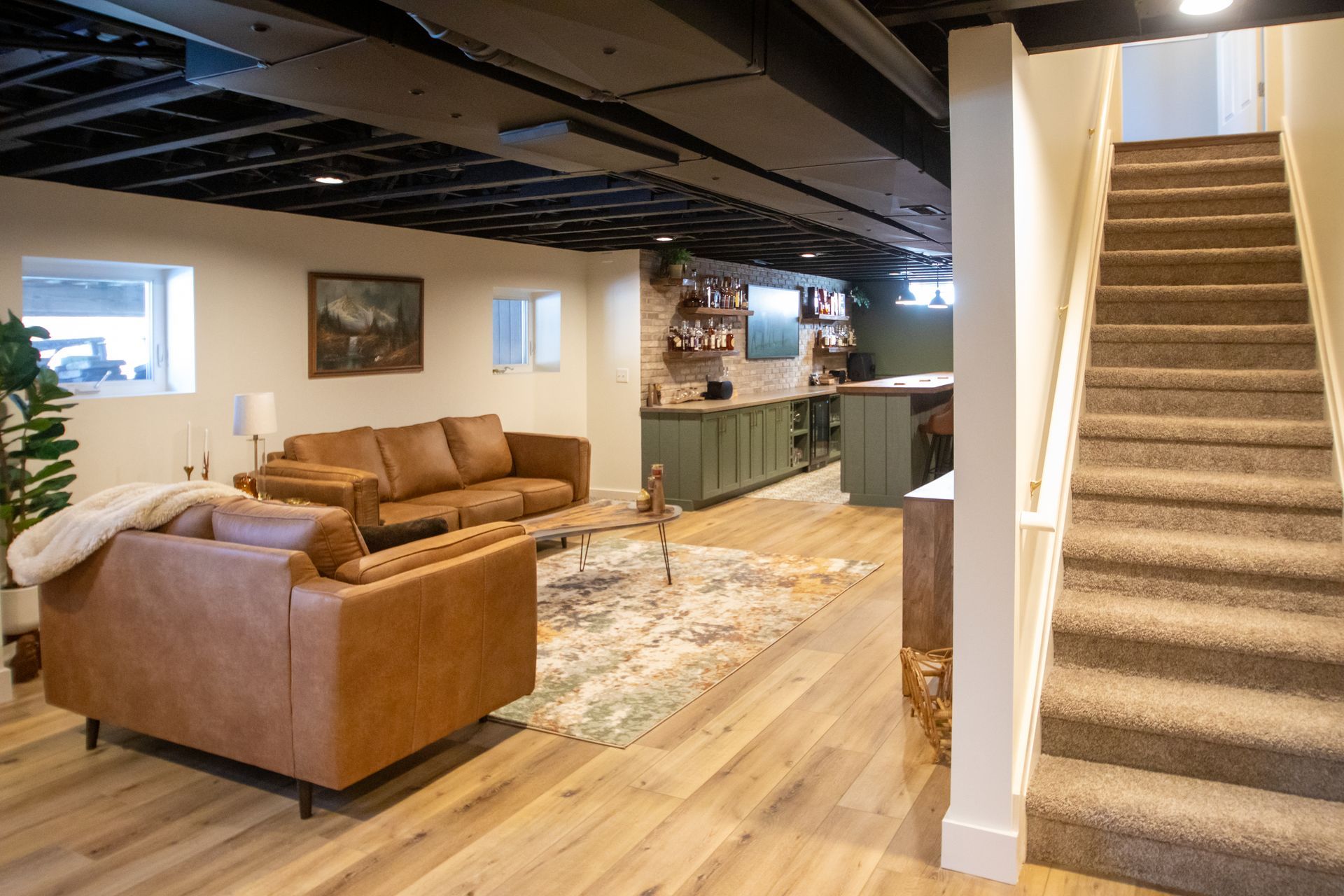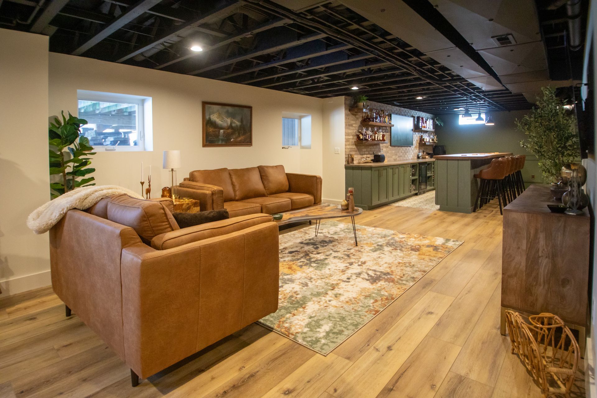 Spacious finished basement with a poker table, pool table, bar area, and multiple seating areas.