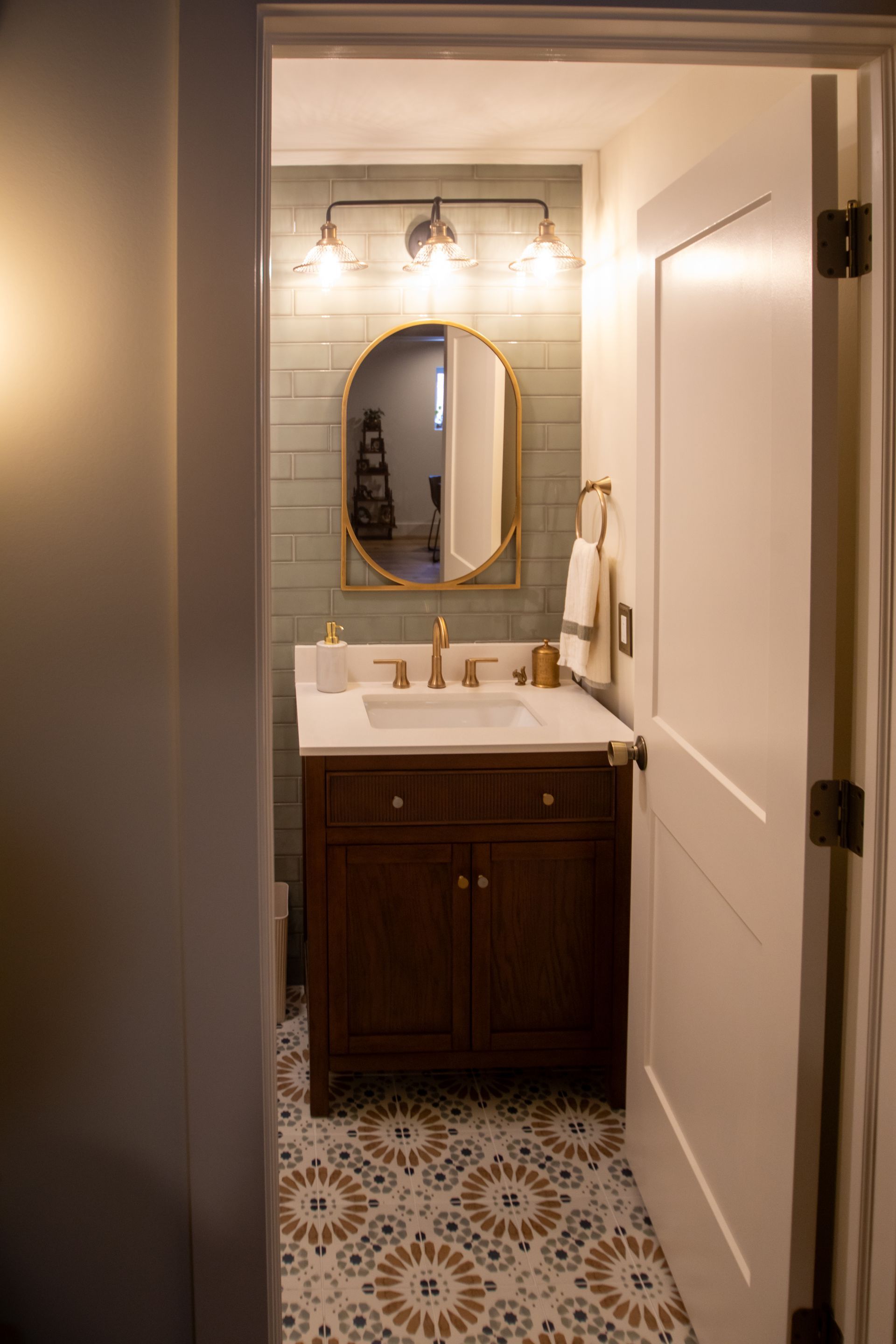 Bathroom with blue vanity, patterned tile floor, arched mirrors, and two round lights.