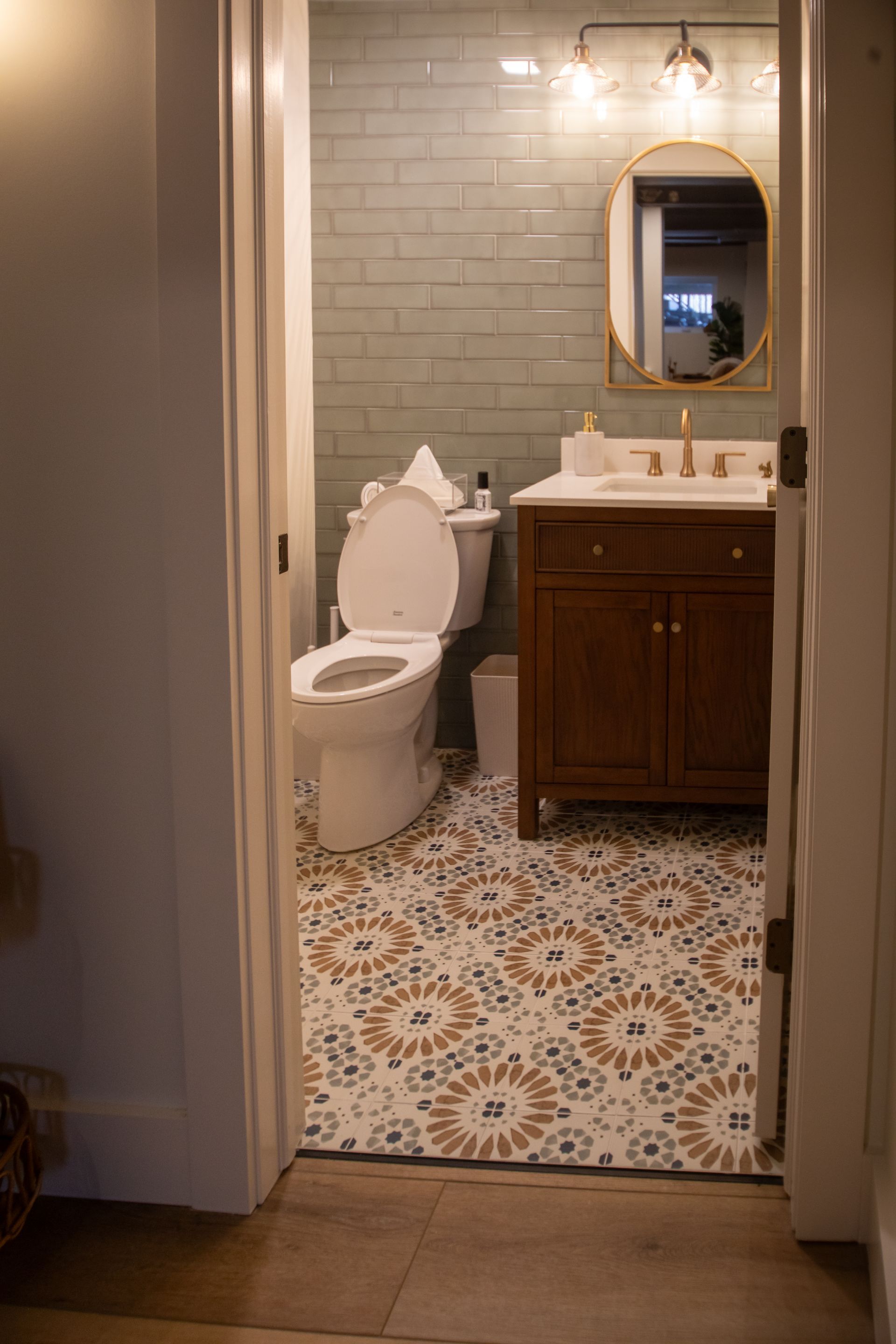 Bathroom with navy vanity, dual mirrors, and patterned tile floor.