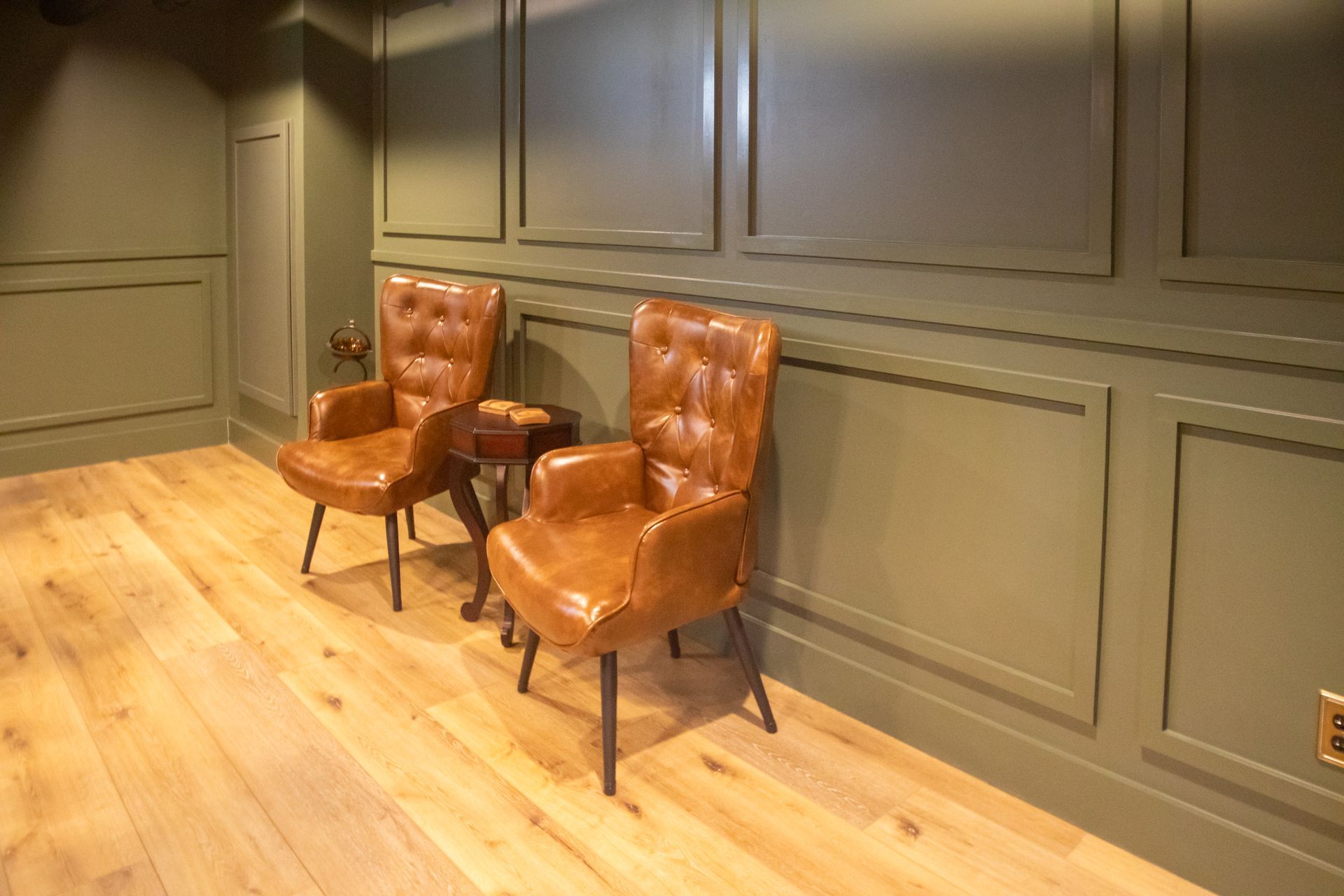Elegant, dark wood-paneled room with a multi-level floor, ornate ceiling, and doors leading to a bar area.